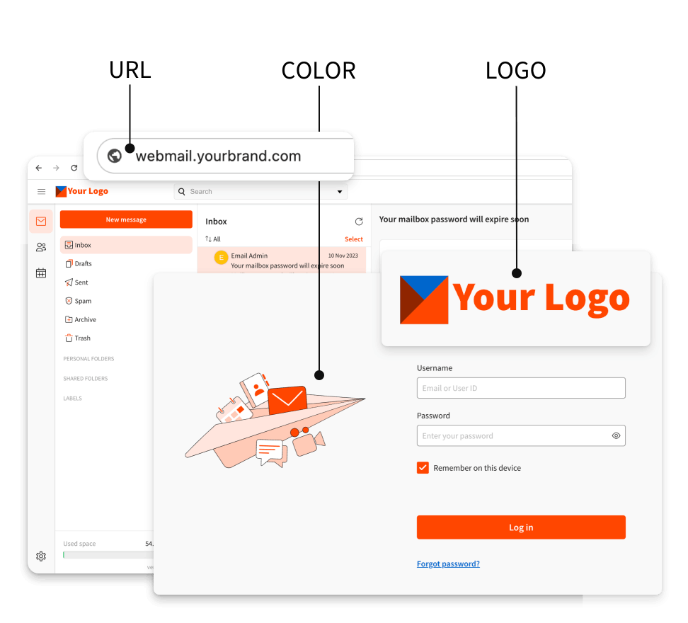 Buzones de correo electrónico desde 8 GB hasta 100 GB, Contactos y Calendarios compartidos.